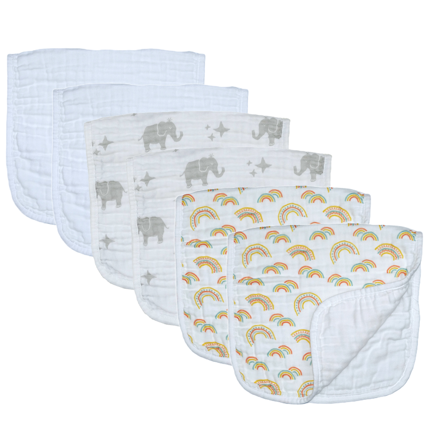 - 6 Pack 3 ply Cotton Muslin Burp Cloths Mix 2 Scandi Rainbow, 2 White, 2 Woodland