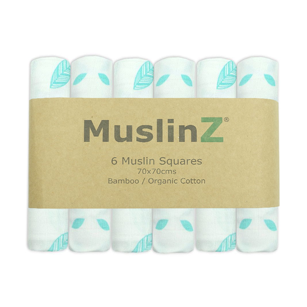 MuslinZ 6 Pack Bamboo/Organic Cotton Muslin Squares 70x70cm – NEW Aqua Leaf