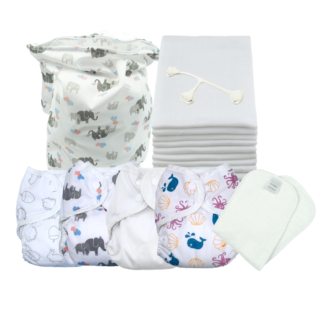 MuslinZ Newborn Reusable Nappy Kit – Washable Diaper Bundle – 4 Nappy Covers – 12 Muslin Nappies – 1 Bamboo Booster – 1 Nappy Fastener – 1 Wet Nappy Bag – Great Starter kit (Unisex)